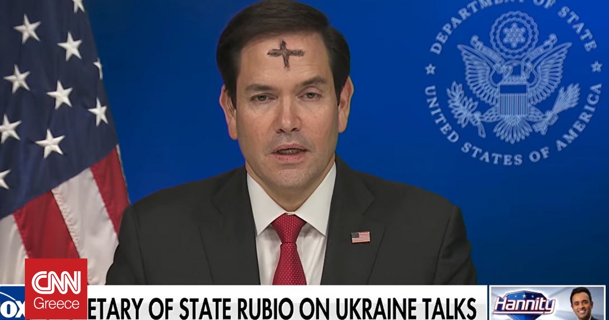 Με έναν σταυρό στο μέτωπό του εμφανίστηκε σε συνέντευξή του στο Fox News ο υπουργός Εξωτερικών των ΗΠΑ, Μάρκο Ρούμπιο, για να μιλήσει για τις εξελίξεις σχετικά με την Ουκρανία, την κρίση στη Μέση Ανατολή και την ομιλία Τραμπ στο Κογκρέσο.