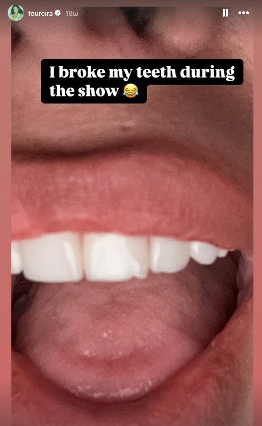 «Έσπασα το δόντι μου κατά τη διάρκεια του show», έγραψε η Ελένη Φουρέιρα στην ανάρτησή της και έβαλε ακόμα ένα emoji που κλαίει από τα γέλια.