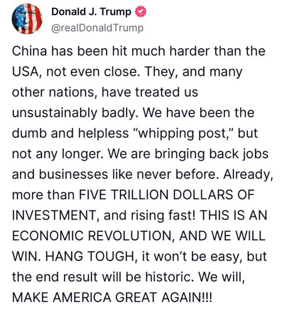 «Αυτή είναι μια οικονομική επανάσταση και θα κερδίσουμε», έγραψε με κεφαλαία γράμματα σήμερα ο Αμερικανός πρόεδρος στην πλατφόρμα του Truth Social, λέγοντας προς τους συμπατριώτες του «Κρατάτε γερά, αυτό δεν θα είναι εύκολο», υποσχόμενος ωστόσο ότι «το τελικό αποτέλεσμα θα είναι ιστορικό».