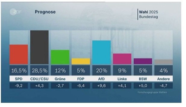 Ακολουθούν οι Σοσιαλδημοκράτες (SPD) του Όλαφ Σολτς με 16,5%, οι Πράσινοι (Grune) του Ρόμπερτ Χάμπεκ