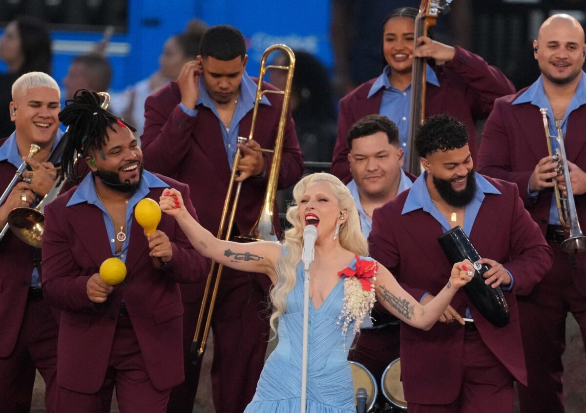 Ένα πλήθος χορευτών διαλύθηκε ξαφνικά, αποκαλύπτοντας τη Lady Gaga να στέκεται μπροστά από μια μπάντα, φορώντας ένα baby blue φόρεμα με ένα κόκκινο άνθος ιβίσκου, ως φόρο τιμής στη γενέτειρα του Bad Bunny, το Πουέρτο Ρίκο.