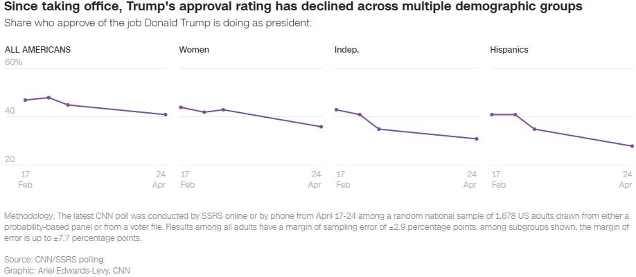 Η έγκριση του χειρισμού της προεδρίας από τον Τραμπ μειώθηκε κατά 4 μονάδες από τον Μάρτιο και 7 μονάδες χαμηλότερη από ό,τι ήταν στα τέλη Φεβρουαρίου. Μόλις το 22% δηλώνει ότι εγκρίνει σθεναρά τις πολιτικές Τραμπ, ένα νέο χαμηλό, και περίπου το διπλάσιο δηλώνει ότι αποδοκιμάζει έντονα (45%).
