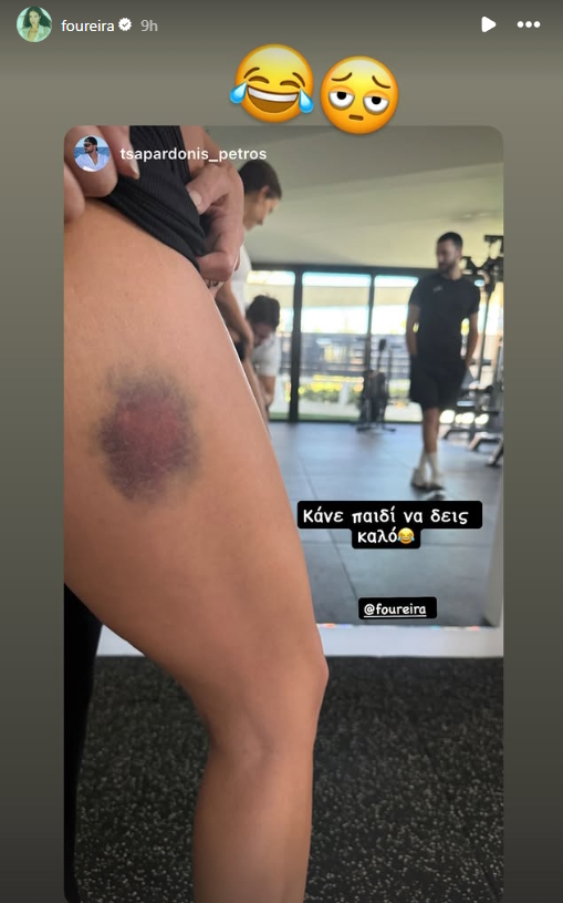 «Κάνε παιδί να δεις καλό», έγραψε ο Πέτρος Τσαπαρδώνης, δημοσιεύοντας τη μεγάλη μελανιά που είχε στο πόδι της η τραγουδίστρια και εκείνη έκανε repost, προσθέτοντας φατσούλες με γελάκια.