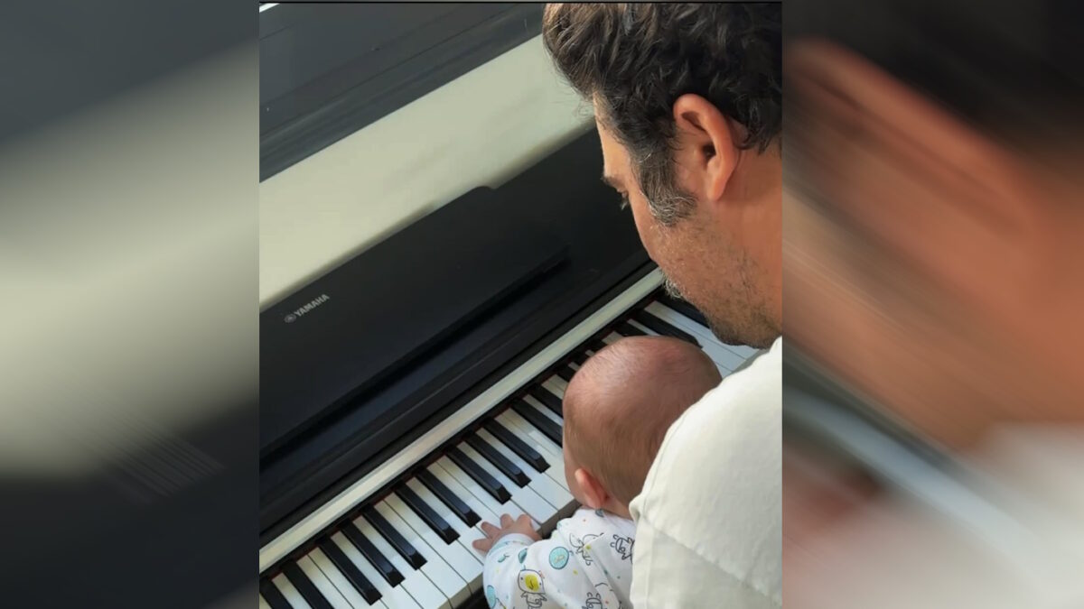 Σε αυτήν ο σύζυγός της και ο 3ων μηνών γιος τους κάθονται στο πιάνο. Μάλιστα, το μωράκι, έχει βάλει τα χεράκια του στα πλήκτρα, δημιουργώντας κάποια μελωδία, ενώ ο μπαμπάς του το κρατά σφιχτά στην αγκαλιά του.