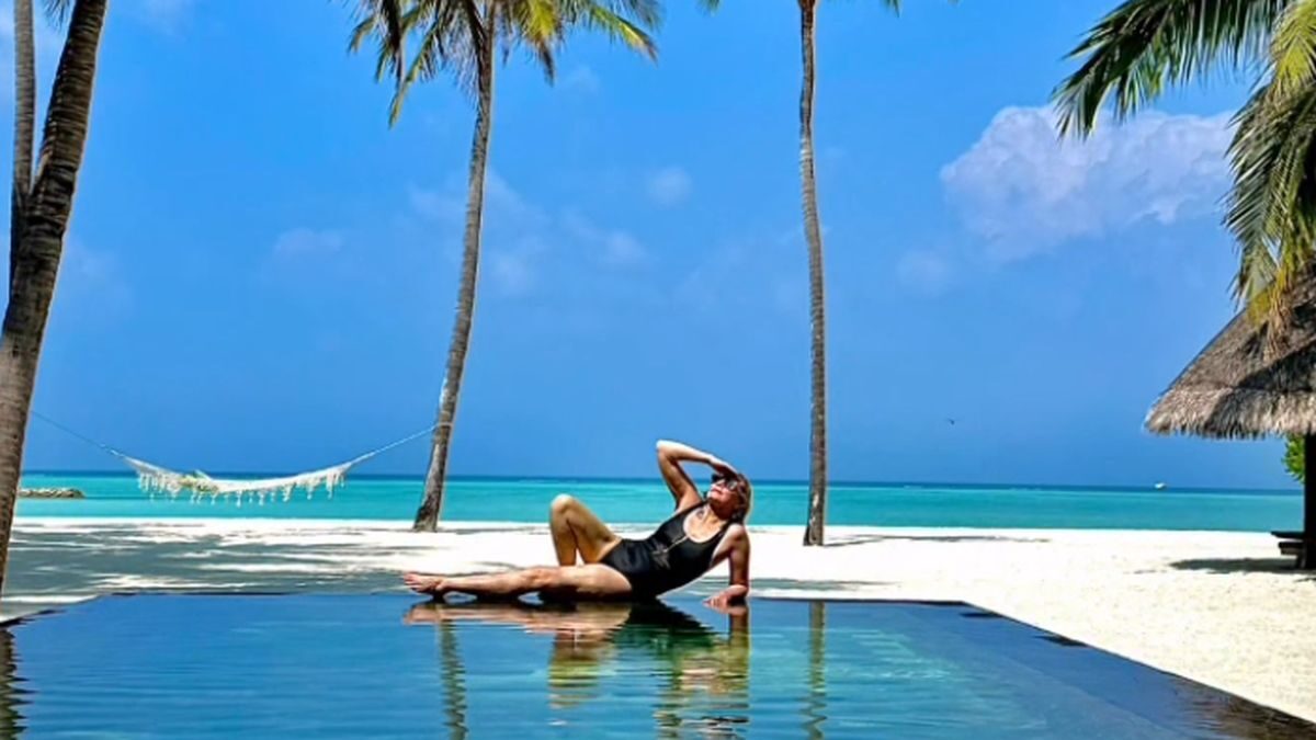 Η Κιμ Κατράλ με μαύρο ολόσωμο μαγιό στις Μαλδίβες