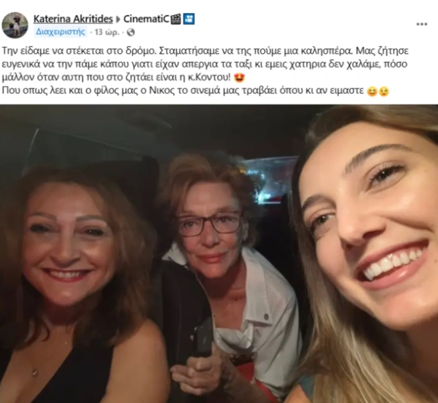 «Την είδαμε να στέκεται στον δρόμο. Σταματήσαμε να της πούμε μια καλησπέρα. Μας ζήτησε ευγενικά να την πάμε κάπου γιατί είχαν απεργία τα ταξί κι εμείς χατίρια δεν χαλάμε, πόσω μάλλον όταν αυτήν που στο ζητάει είναι η κυρία Κοντού», έγραψε χαρακτηριστικά η γυναίκα στη δημοσίευσή της.