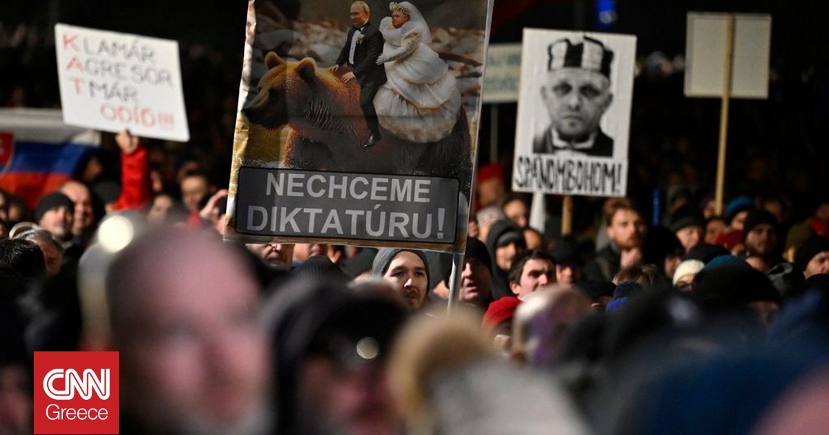 Δεκάδες χιλιάδες διαδηλωτές συγκεντρώθηκαν σήμερα στην κεντρική πλατεία της Μπρατισλάβας, κρατώντας πλακάτ με συνθήματα κατά του Σλοβάκου πρωθυπουργού Ρόμπερτ Φίτσο και της στροφής του προς τη Ρωσία, καθώς η ένταση μεταξύ της κυβέρνησης και της αντιπολίτευσης διογκώνεται.