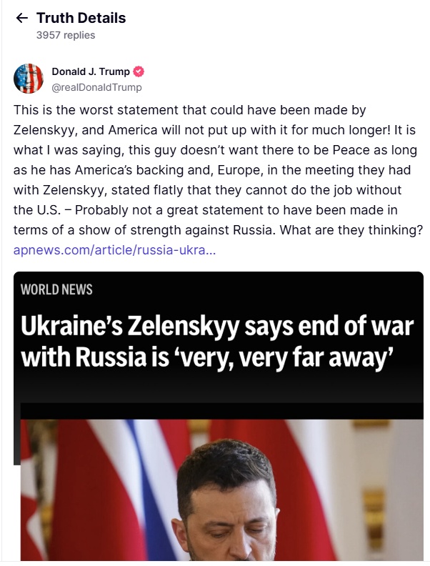 Σε μια ανάρτηση στο Truth Social, ο Τραμπ κοινοποίησε ένα άρθρο του Associated Press στο οποίο ο Ζελένσκι λέει ότι το τέλος του πολέμου είναι «πολύ, πολύ μακριά», με τον Αμερικανό πρόεδρο να σχολιάζει ότι «αυτή είναι η χειρότερη δήλωση που θα μπορούσε να κάνει ο Ζελένσκι».