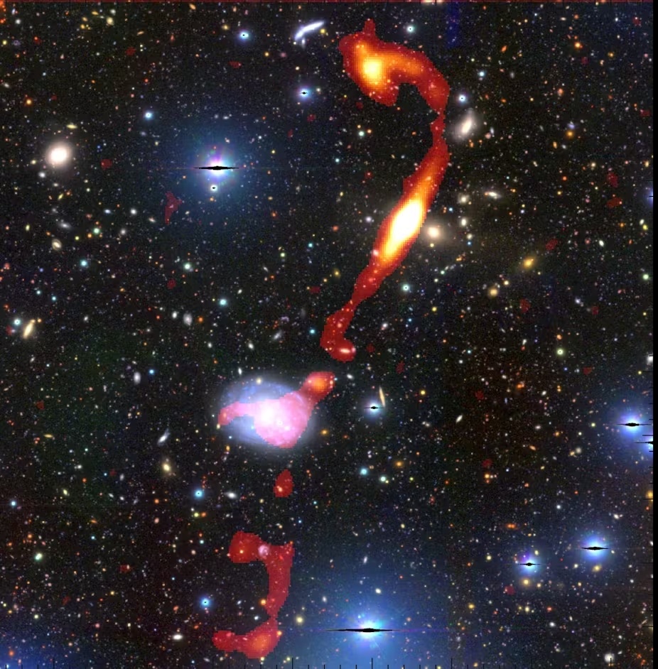 Οι λαμπεροί πίδακες πλάσματος του Μπελά φαίνονται με κόκκινο και κίτρινο χρώμα. Τα φώτα στο φόντο είναι το σμήνος γαλαξιών που τον περιβάλλει