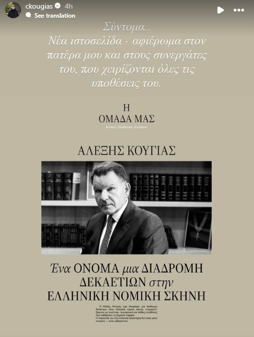 Όπως έγραψε σε story που ανέβασε το απόγευμα της Πέμπτης (18.09.2025), ο Χρίστος Κούγιας ετοιμάζει μία νέα ιστοσελίδα – αφιέρωμα στον πατέρα του, Αλέξη Κούγια αλλά και στους συνεργάτες του αείμνηστου δικηγόρου.