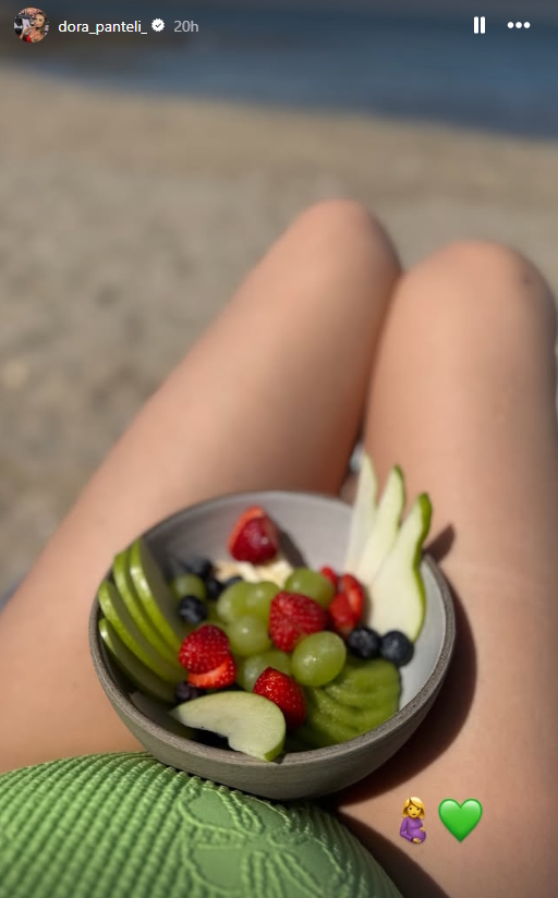 Η ανάρτησή της κέρδισε αμέσως αμέτρητα likes και ευχές για το Πάσχα και τον ερχομό του μωρού της. Παράλληλα, η Δώρα Παντέλη κάθισε στην παραλία και απόλαυσε μία δροσιστική φρουτοσαλάτα.