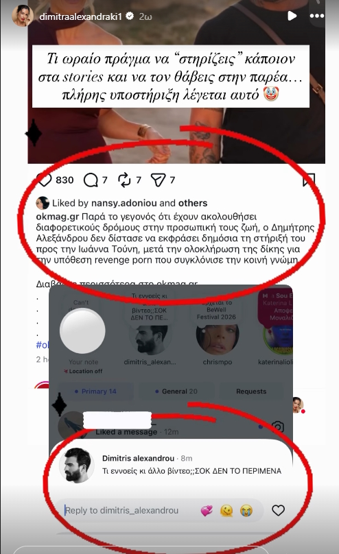 «Τι ωραίο πράγμα να “στηρίζεις” κάποιον στα stories και να τον θάβεις στην παρέα. Πλήρης υποστήριξη λέγεται αυτό», έγραψε η Δήμητρα Αλεξανδράκη για τον Δημήτρη Αλεξάνδρου.