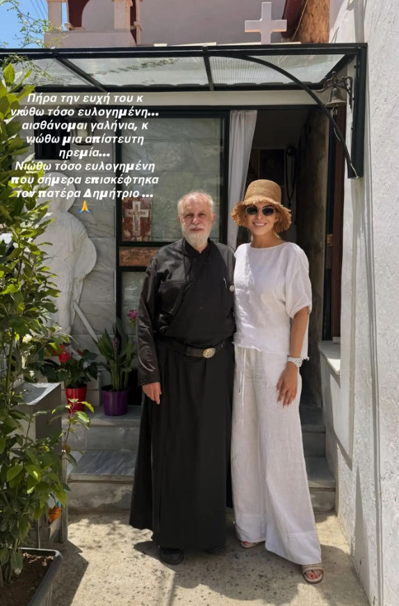 «Πήρα την ευχή του και νιώθω τόσο ευλογημένη. Αισθάνομαι γαλήνια και νιώθω μία απίστευτη ηρεμία… Νιώθω τόσο ευλογημένη που σήμερα επισκέφθηκα τον πατέρα Δημήτριο… Το έργο που κάνει είναι θεάρεστο, του έχει δώσει ο Θεός αυτή τη μεγάλη δύναμη. Είναι ένας πνευματικός καθοδηγητής. Ο πατέρας Δημήτριος με τη βοήθεια του Τιμίου Σταυρού, κάνει θαύματα. Ευχαριστώ για την υπέροχη φιλοξενία» ανέφερε στο Instagram η παρουσιάστρια του Alpha.