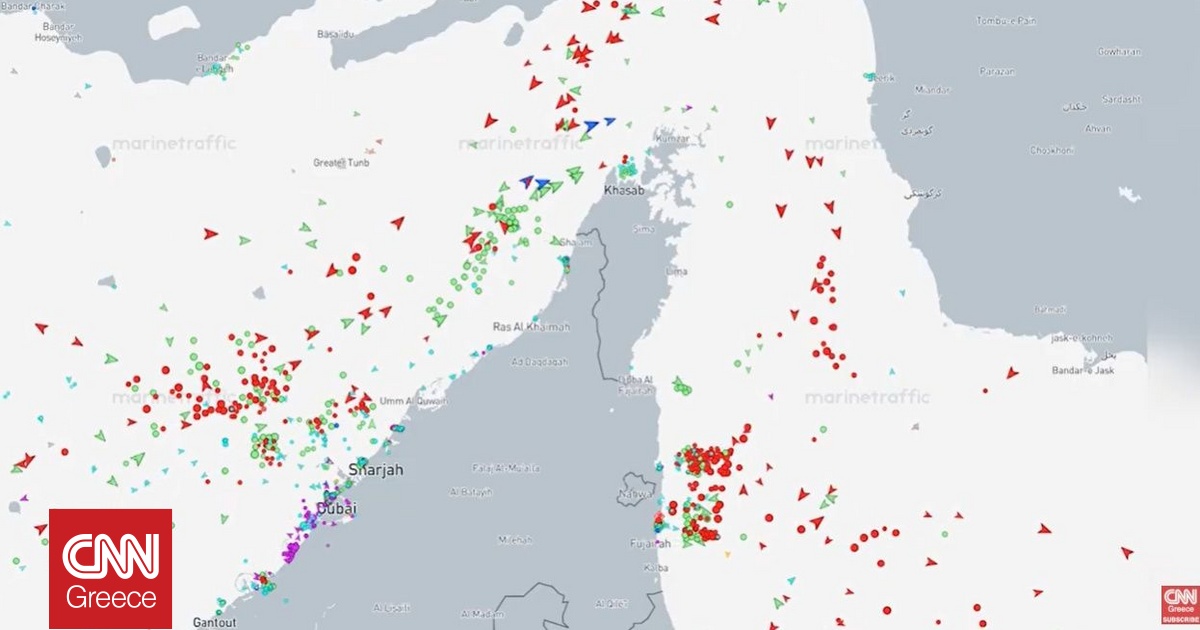 Δεξαμενόπλοια φαίνονται να αλλάζουν πορεία και να κάνουν στροφή στην πλευρά του Περσικού Κόλπου στα Στενά του Ορμούζ, όπως δείχνουν δεδομένα παρακολούθησης από το Marine Traffic σε βίντεο που μεταδίδει του CNNi.