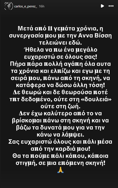 Σας ευχαριστώ όλους και πάλι μέσα από την καρδιά μου! Θα τα πούμε πάλι κάπου, κάποια στιγμή, σε μια επόμενη σκηνή», έγραφε η ανακοίνωση του Carlos Perez στο Instagram.