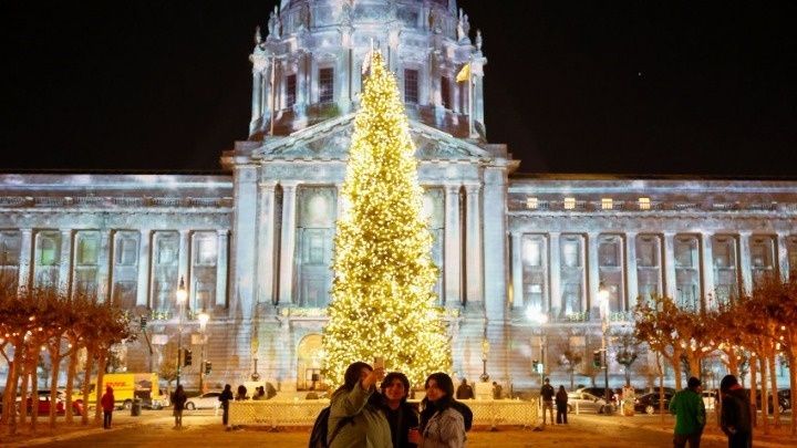 Αστραφτερές σκεπές, λαμπερά τελεφερίκ και φωτισμένες γειτονιές συνθέτουν το εντυπωσιακό χριστουγεννιάτικο σκηνικό στο Σαν Φρανσίσκο. Σε γιγάντιο εικογραφημένο βιβλίο μετατρέπεται κάθε απόγευμα το δημαρχείο της πόλης, καθώς κινούμενες ψηφιακές εικόνες προβάλλονται στις δύο προσόψεις του.